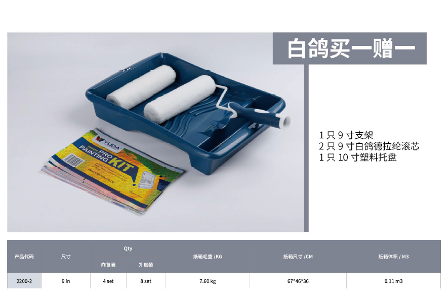 玉达进口白鸽套装滚刷无痕油漆涂料刷 乳胶黑板水性漆专用滚刷9寸