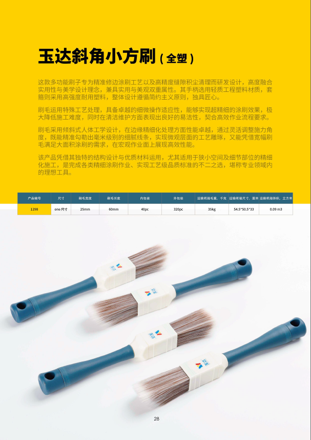 玉达斜角小方刷凭借其独特的结构设计与优质材料运用,尤其适用于狭小空间及细节部位
