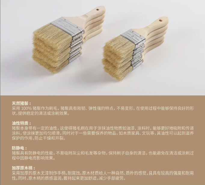 猪鬃具有防静电的性能,不易吸附灰尘和毛发等杂物,保持刷子自身的清洁,也能避免在清洁或涂刷过